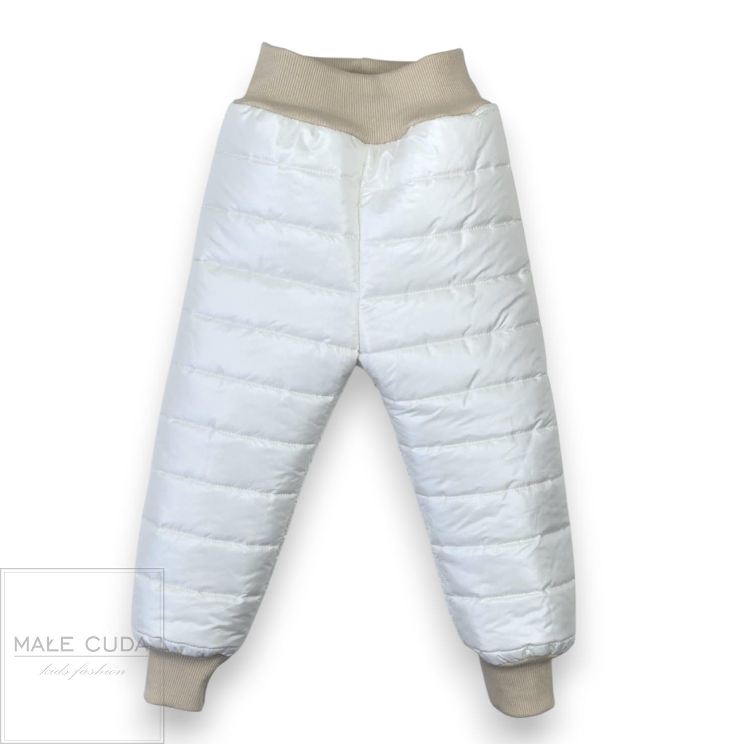 Zimowe pikowane spodnie na podszewce wykończone w pasie oraz w nogawkach bawełnianym ściągaczem.